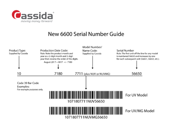 The Cassida 6600 is designed to detect and flag any suspected counterfeit notes. This unit provides Ultraviolet (UV), and Magnetic (MG) (MG available on certain model).